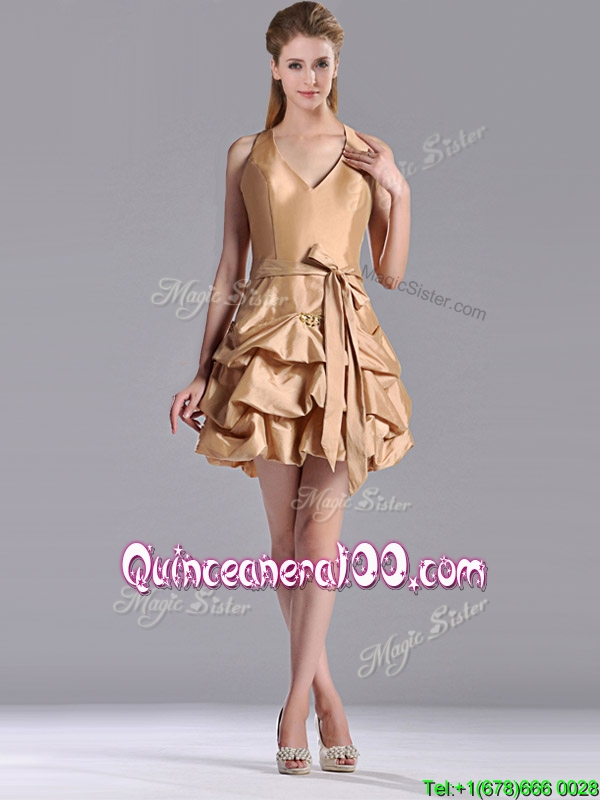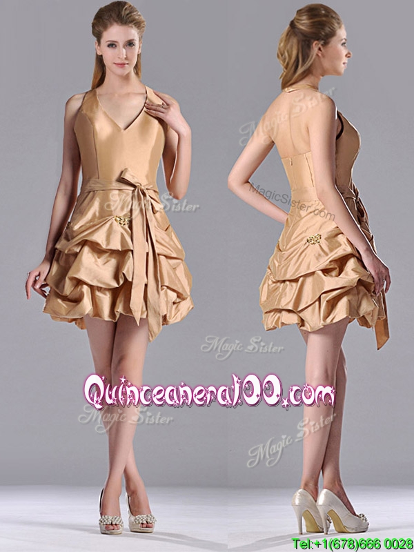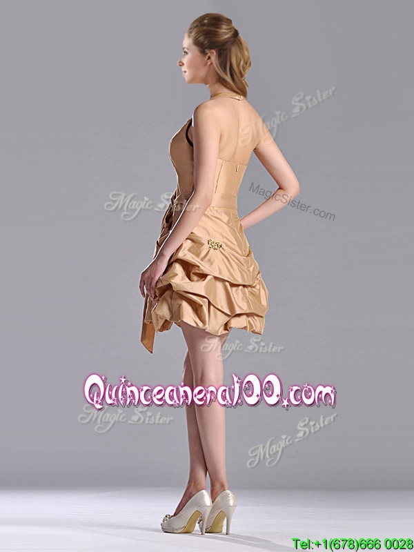 Neckline : Halter topShown Color : ChampagneSleeve Length : sleevelessHemline : mini lengthBack Detail : ZipperFabric : TaffetaEmbellishment : Beading,Pick Ups,BowknotOccasion : Prom,PartySeason : Spring,Summer,Fall