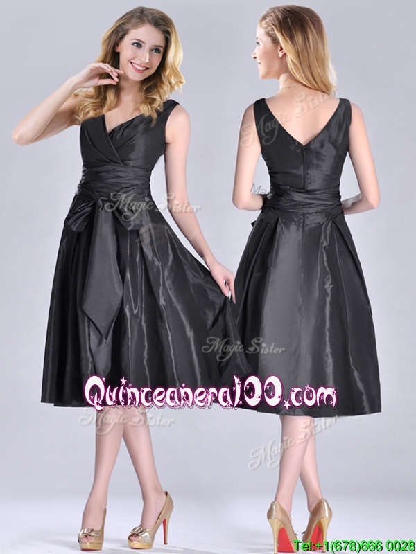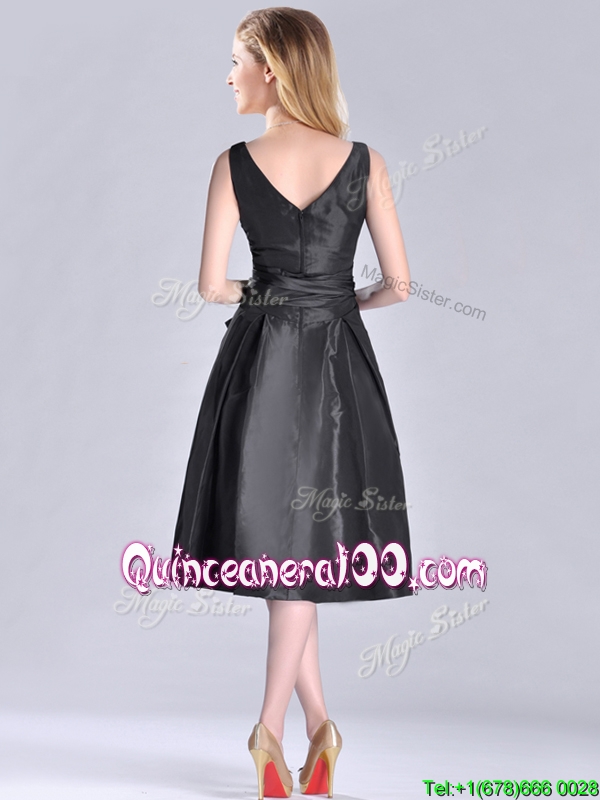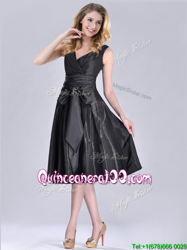Neckline : V-neckShown Color : BlackSleeve Length : sleevelessHemline : tea lengthBack Detail : ZipperFabric : TaffetaEmbellishment : Ruching,BowknotOccasion : PromSeason : Spring,Summer,Fall,Winter