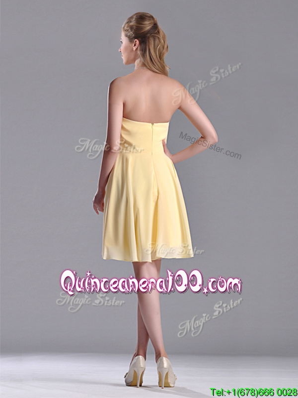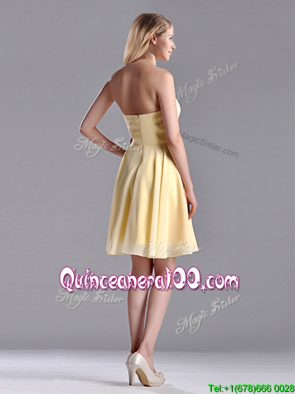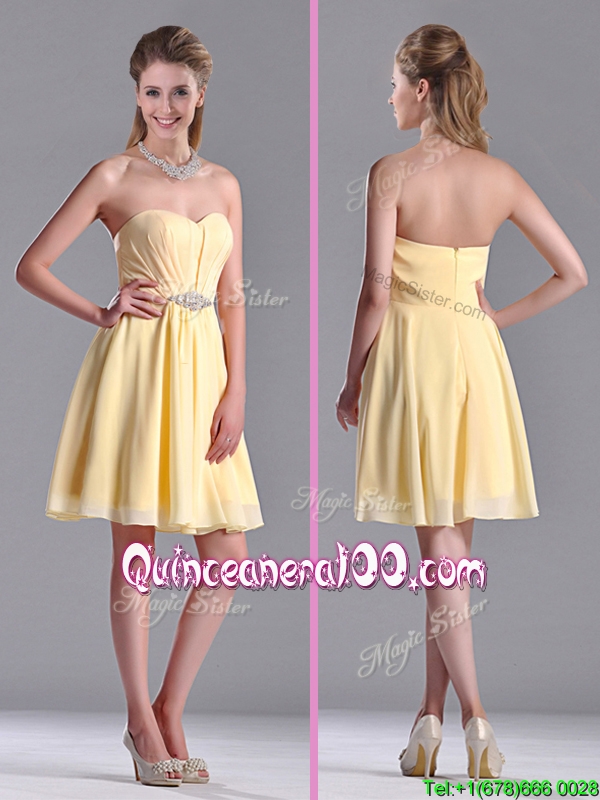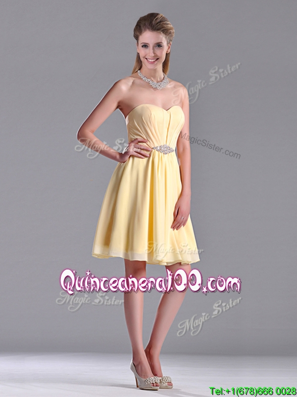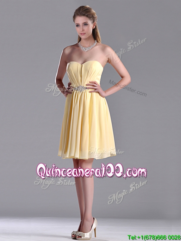 Neckline : SweetheartShown Color : YellowSleeve Length : sleevelessHemline : mini lengthBack Detail : ZipperFabric : ChiffonEmbellishment : BeadingOccasion : Prom,PartySeason : Spring,Summer,Fall