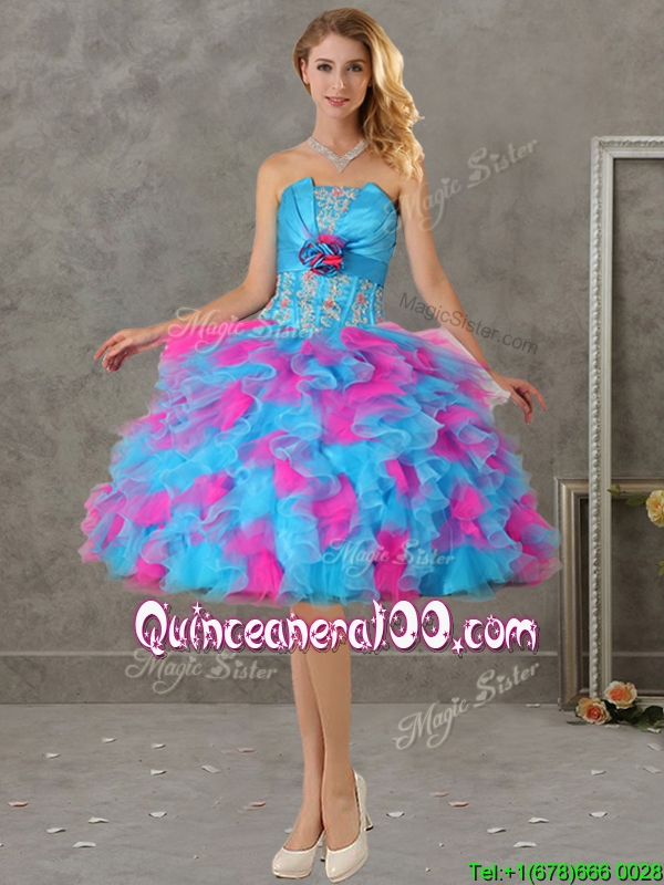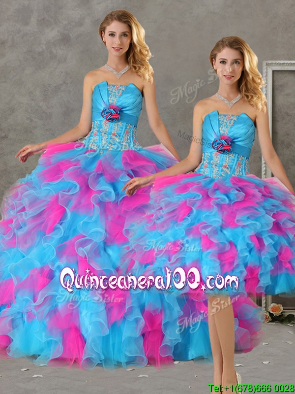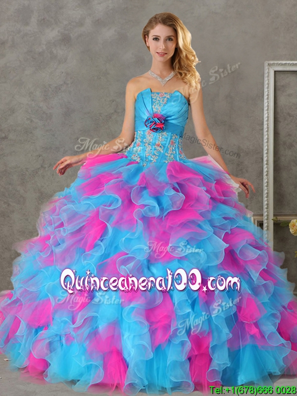 Neckline : StraplessShown Color : Pink,BlueSleeve Length : sleevelessHemline : floor lengthBack Detail : Lace upFabric : OrganzaEmbellishment : Appliques,Ruffles,Hand Made FlowerOccasion : Military Ball,Sweet 16,QuinceaneraSeason : Spring,Summer,Fall,Winter