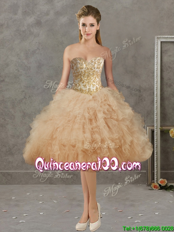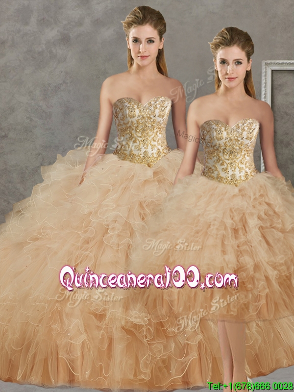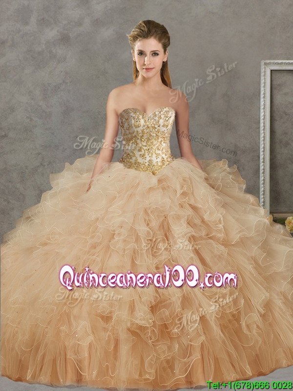 Neckline : SweetheartShown Color : ChampagneSilhouette : Ball GownsSleeve Length : sleevelessHemline : floor lengthBack Detail : Lace upFabric : OrganzaEmbellishment : Beading,RufflesOccasion : Military Ball,Sweet 16,QuinceaneraSeason : Spring,Summer,Fall,Winter
