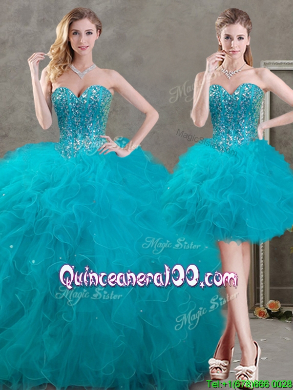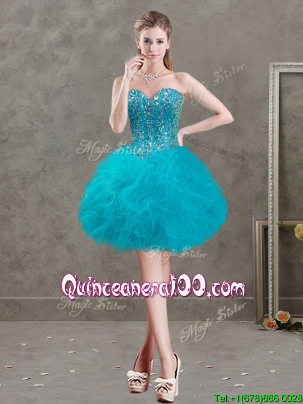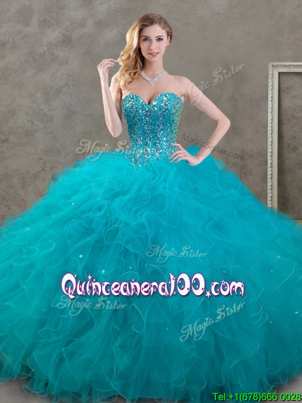 Neckline : SweetheartShown Color : TealSleeve Length : sleevelessHemline : floor lengthBack Detail : Lace upFabric : OrganzaEmbellishment : Beading,RufflesOccasion : Military Ball,Sweet 16,QuinceaneraSeason : Spring,Summer,Fall,Winter