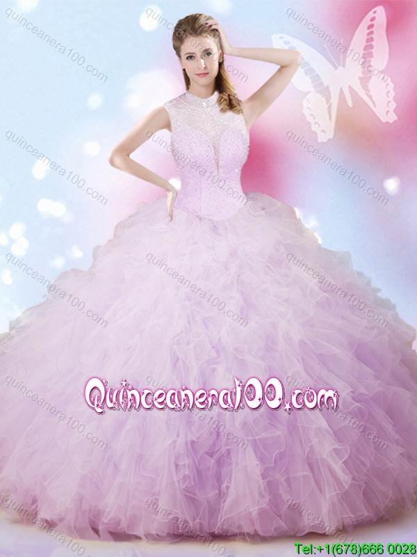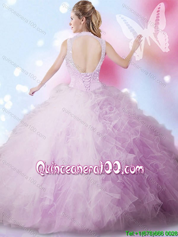 Neckline : High-neckShown Color : LavenderSilhouette : Ball GownsSleeve Length : sleevelessHemline : floor lengthBack Detail : Lace upFabric : TulleEmbellishment : Beading,RufflesOccasion : Military Ball,Sweet 16,QuinceaneraSeason : Spring,Summer,Fall,Winter