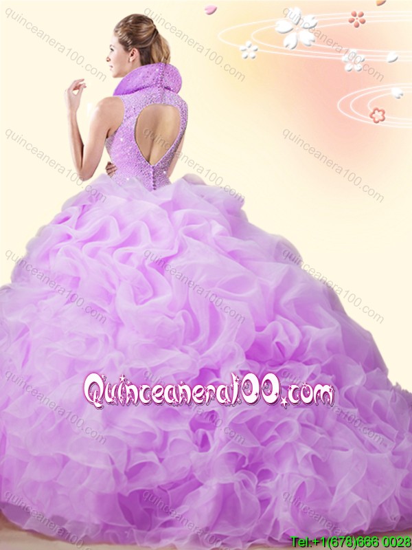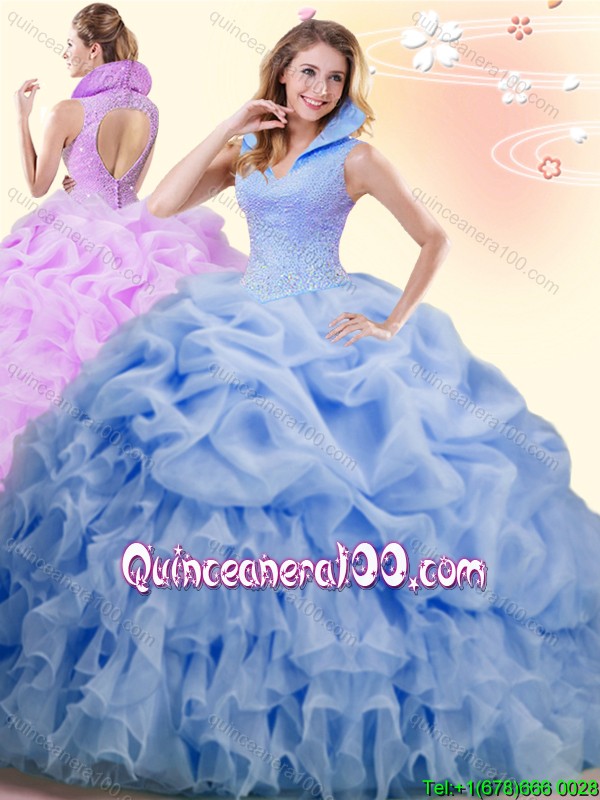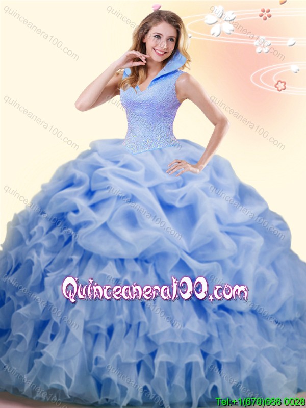 Neckline : High-neckShown Color : BlueSilhouette : Ball GownsSleeve Length : sleevelessHemline : with trainBack Detail : BacklessFabric : OrganzaEmbellishment : Beading,Ruffles,Pick UpsOccasion : Military Ball,Sweet 16,QuinceaneraSeason : Spring,Summer,Fall,Winter