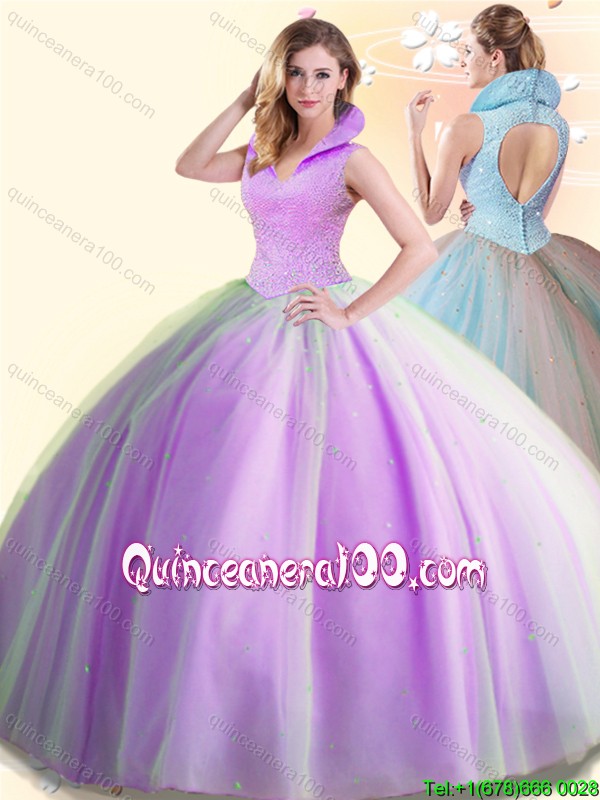 Neckline : High-neckShown Color : LilacSilhouette : Ball GownsSleeve Length : sleevelessHemline : floor lengthBack Detail : BacklessFabric : TulleEmbellishment : BeadingOccasion : Military Ball,Sweet 16,QuinceaneraSeason : Spring,Summer,Fall,Winter
