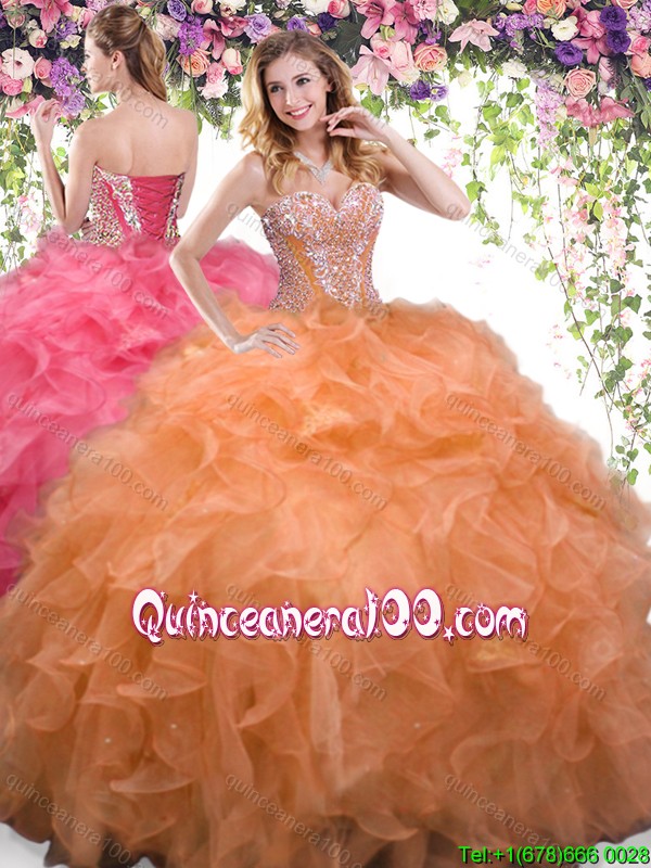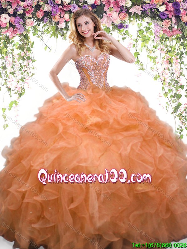 Neckline : SweetheartShown Color : OrangeSleeve Length : sleevelessHemline : floor lengthBack Detail : Lace upFabric : OrganzaEmbellishment : Beading,RufflesOccasion : Military Ball,Sweet 16,QuinceaneraSeason : Spring,Summer,Fall,Winter