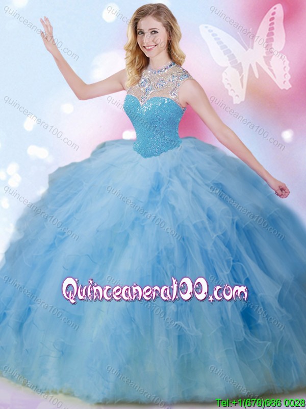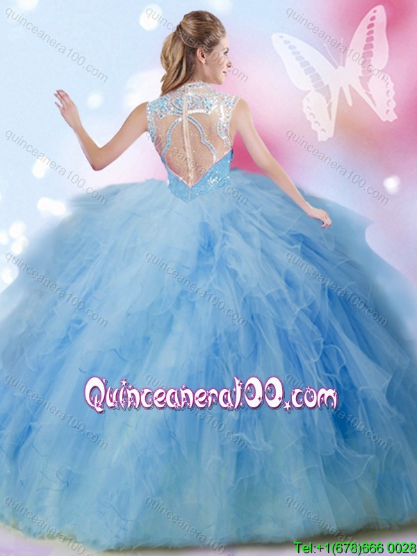Neckline : High-neckShown Color : BlueSleeve Length : sleevelessHemline : floor lengthBack Detail : ZipperFabric : TulleEmbellishment : Beading,Ruffles,SequinsOccasion : Military Ball,Sweet 16,QuinceaneraSeason : Spring,Summer,Fall,Winter
