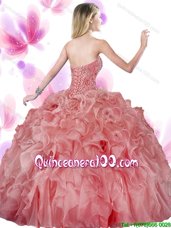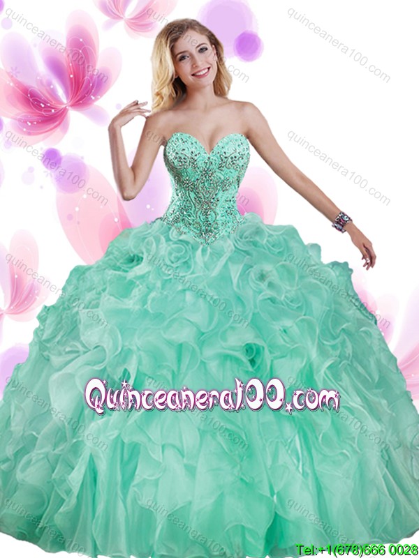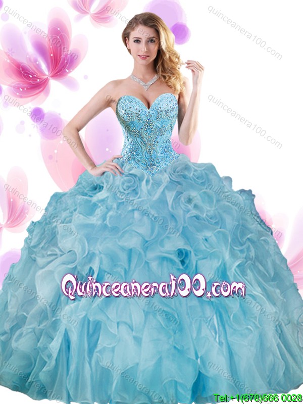Neckline : SweetheartShown Color : TurquoiseSilhouette : Ball GownsSleeve Length : sleevelessHemline : floor lengthBack Detail : Lace upFabric : OrganzaEmbellishment : Beading,RufflesOccasion : Military Ball,Sweet 16,QuinceaneraSeason : Spring,Summer,Fall,Winter