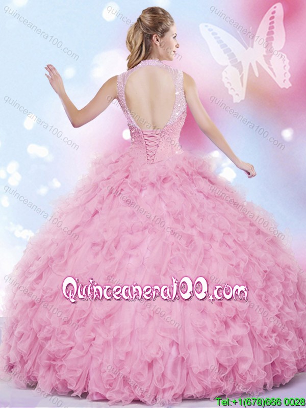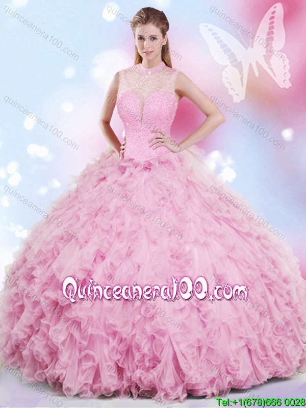 Neckline : High-neckShown Color : Rose PinkSilhouette : Ball GownsSleeve Length : sleevelessHemline : floor lengthBack Detail : Lace upFabric : TulleEmbellishment : Beading,RufflesOccasion : Military Ball,Sweet 16,QuinceaneraSeason : Spring,Summer,Fall,Winter