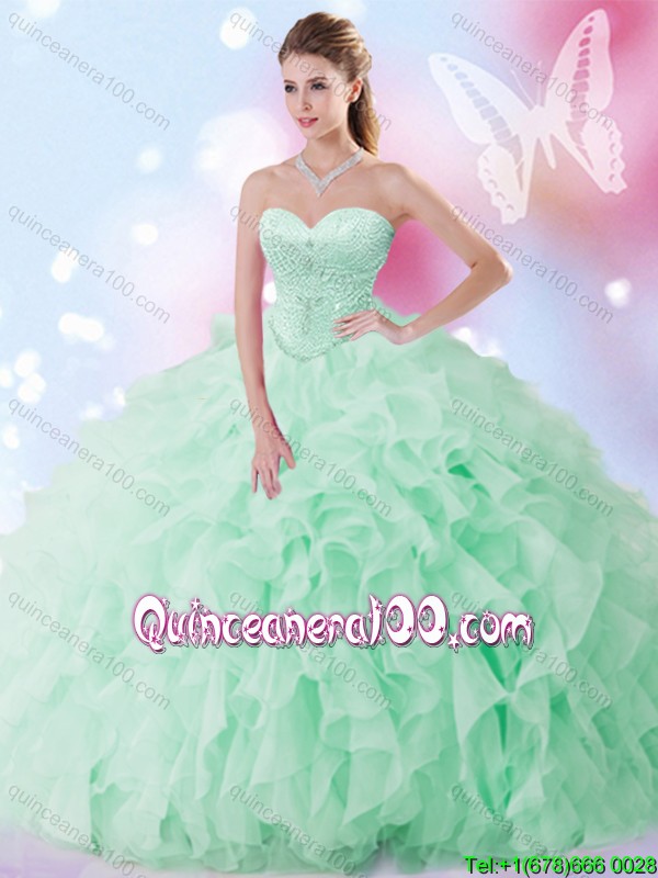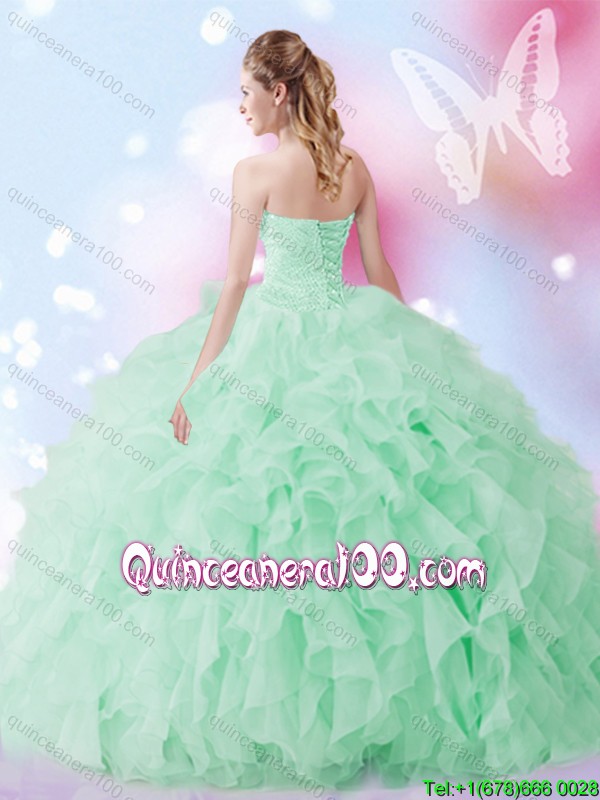 Neckline : SweetheartShown Color : Apple GreenSilhouette : Ball GownsSleeve Length : sleevelessHemline : floor lengthBack Detail : Lace upFabric : OrganzaEmbellishment : Beading,RufflesOccasion : Sweet 16,QuinceaneraSeason : Spring,Summer,Fall,Winter