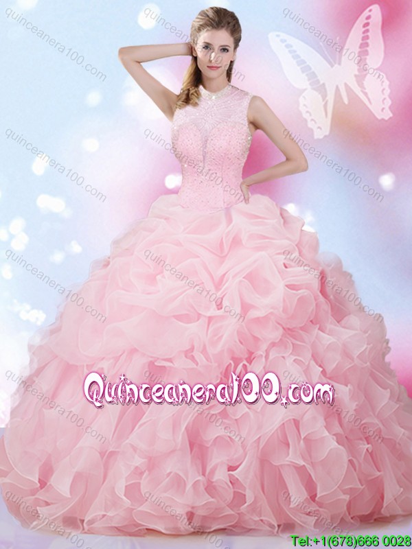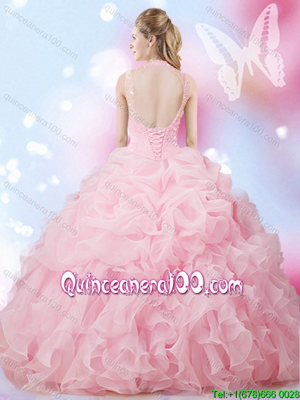 Neckline : High-neckShown Color : Baby PinkSleeve Length : sleevelessHemline : floor lengthBack Detail : Lace upFabric : OrganzaEmbellishment : Beading,Ruffles,Pick UpsOccasion : Military Ball,Sweet 16,QuinceaneraSeason : Spring,Summer,Fall,Winter
