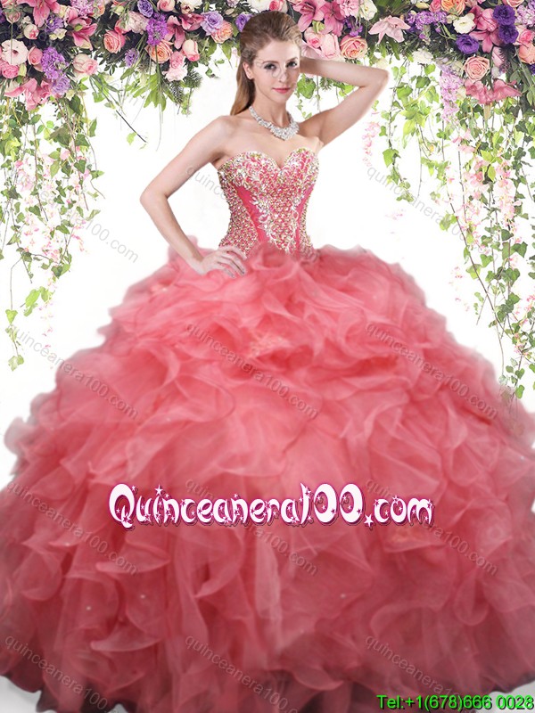 Neckline : SweetheartShown Color : Coral RedSleeve Length : sleevelessHemline : floor lengthBack Detail : Lace upFabric : OrganzaEmbellishment : Beading,RufflesOccasion : Military Ball,Sweet 16,QuinceaneraSeason : Spring,Summer,Fall,Winter