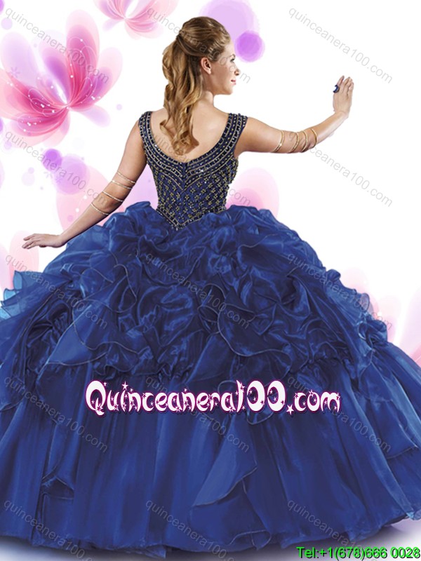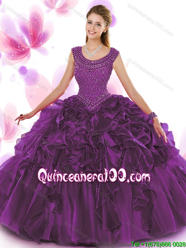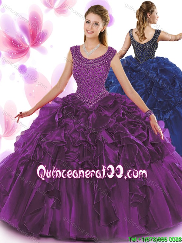 Neckline : ScoopShown Color : Dark PurpleSilhouette : Ball GownsSleeve Length : sleevelessHemline : floor lengthBack Detail : ZipperFabric : OrganzaEmbellishment : Beading,RufflesOccasion : Military Ball,Sweet 16,QuinceaneraSeason : Spring,Summer,Fall,Winter