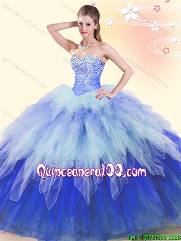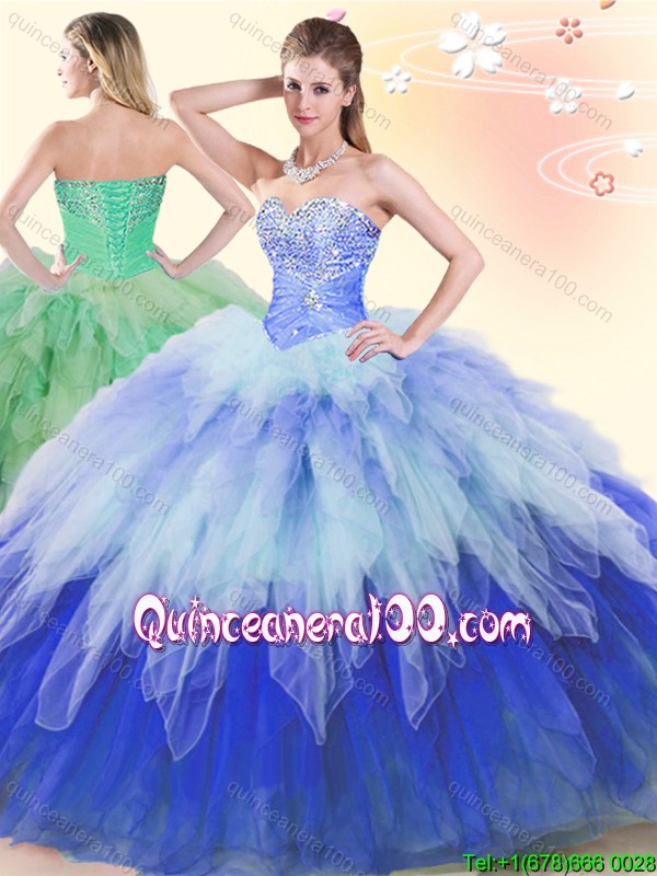 Neckline : SweetheartShown Color : Multi-colorSilhouette : Ball GownsSleeve Length : sleevelessHemline : floor lengthBack Detail : Lace upFabric : TulleEmbellishment : Beading,RufflesOccasion : Sweet 16,QuinceaneraSeason : Spring,Summer,Fall,Winter