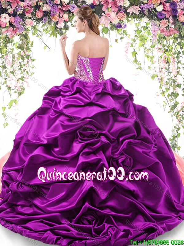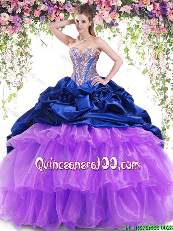 Neckline : SweetheartShown Color : Multi-colorSilhouette : MermaidSleeve Length : sleevelessHemline : with trainBack Detail : Lace upFabric : Organza,TaffetaEmbellishment : Beading,Ruffled Layers,Pick UpsOccasion : Sweet 16,QuinceaneraSeason : Spring,Summer,Fall,Winter
