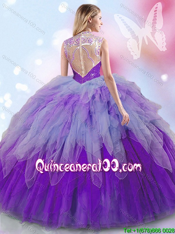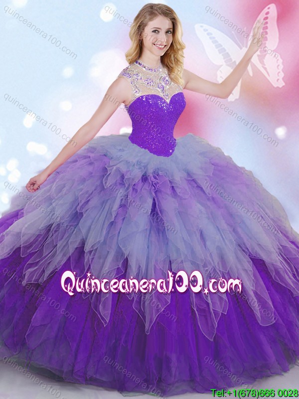 Unique High Neck Rainbow Quinceanera Dress with Ruffles and Beading