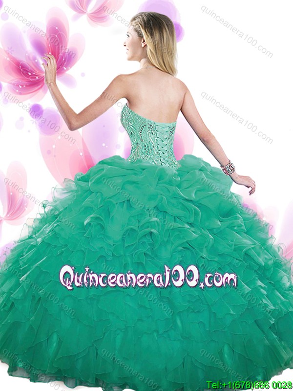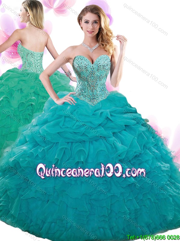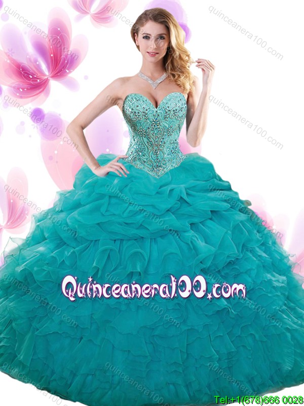 Neckline : SweetheartShown Color : TealSilhouette : Ball GownsSleeve Length : sleevelessHemline : floor lengthBack Detail : Lace upFabric : OrganzaEmbellishment : Beading,Ruffles,Pick UpsOccasion : Sweet 16,QuinceaneraSeason : Spring,Summer,Fall,Winter