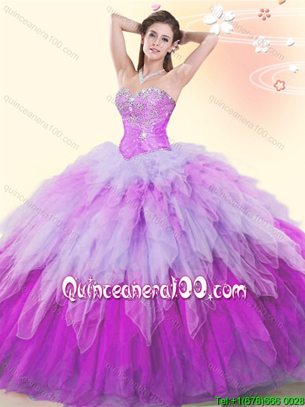 Neckline : SweetheartShown Color : Multi-colorSilhouette : Ball GownsSleeve Length : sleevelessHemline : floor lengthBack Detail : Lace upFabric : TulleEmbellishment : Beading,RufflesOccasion : Sweet 16,QuinceaneraSeason : Spring,Summer,Fall,Winter