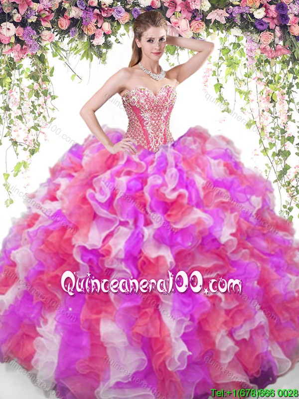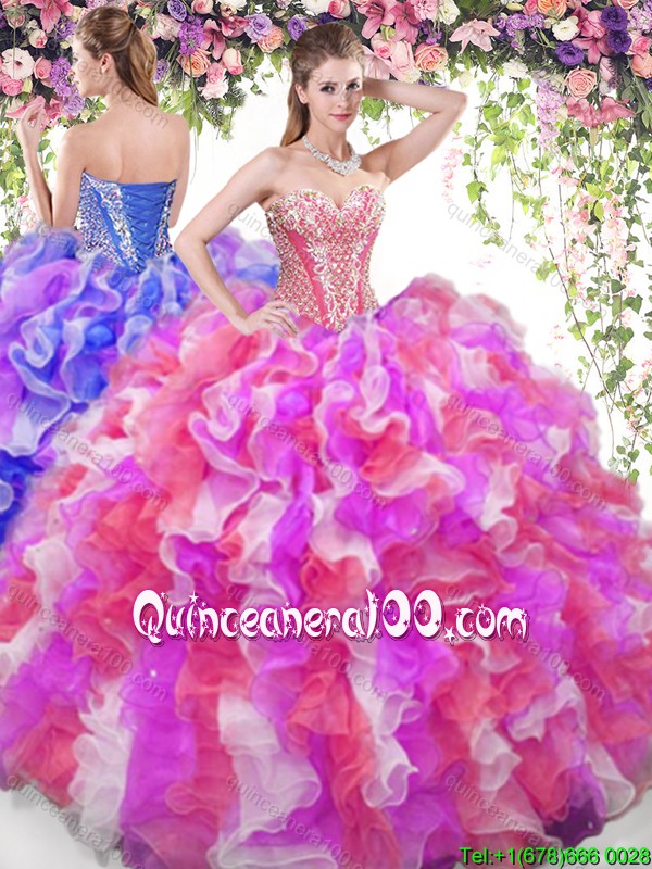 Neckline : SweetheartShown Color : Multi-colorSilhouette : Ball GownsSleeve Length : sleevelessHemline : floor lengthBack Detail : Lace upFabric : OrganzaEmbellishment : Beading,RufflesOccasion : Sweet 16,QuinceaneraSeason : Spring,Summer,Fall,Winter