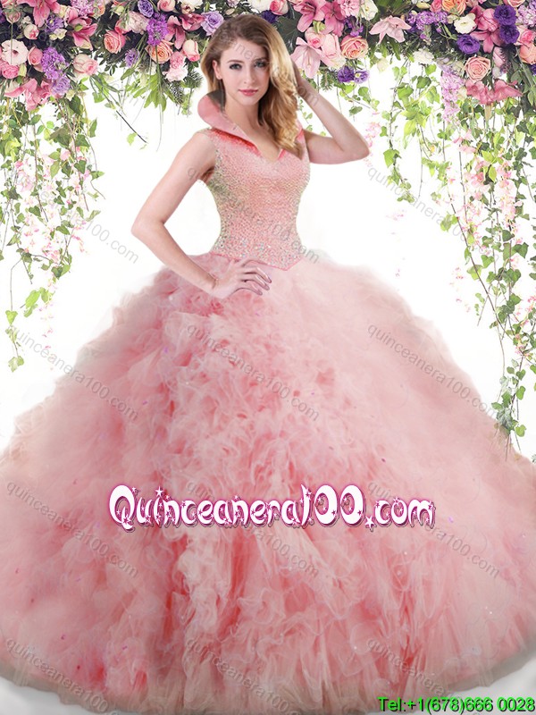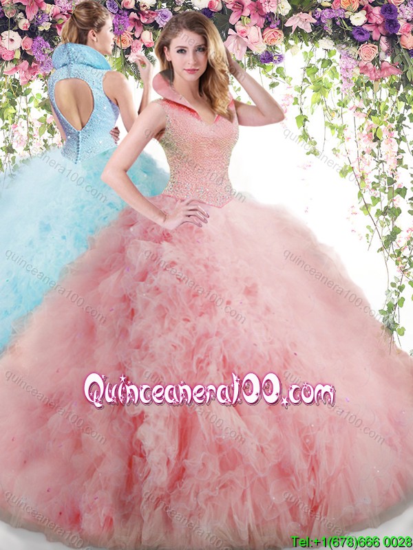 Neckline : High-neckShown Color : Watermelon RedSilhouette : Ball GownsSleeve Length : sleevelessHemline : floor lengthBack Detail : BacklessFabric : TulleEmbellishment : Beading,RufflesOccasion : Military Ball,Sweet 16,QuinceaneraSeason : Spring,Summer,Fall,Winter