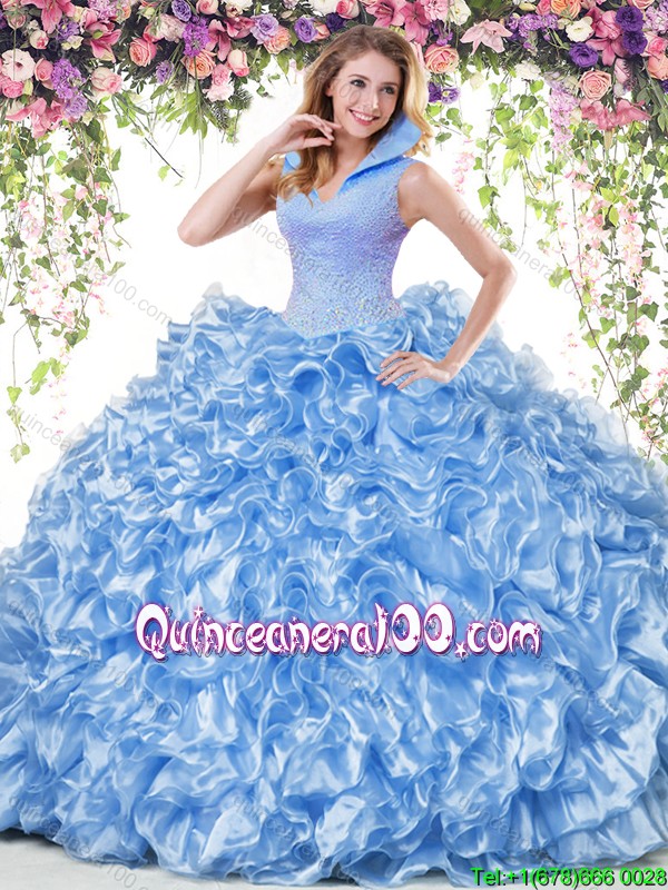 Neckline : SweetheartShown Color : BlueSilhouette : Ball GownsSleeve Length : sleevelessHemline : floor lengthBack Detail : Lace upFabric : OrganzaEmbellishment : Beading,RufflesOccasion : Sweet 16,QuinceaneraSeason : Spring,Summer,Fall,Winter