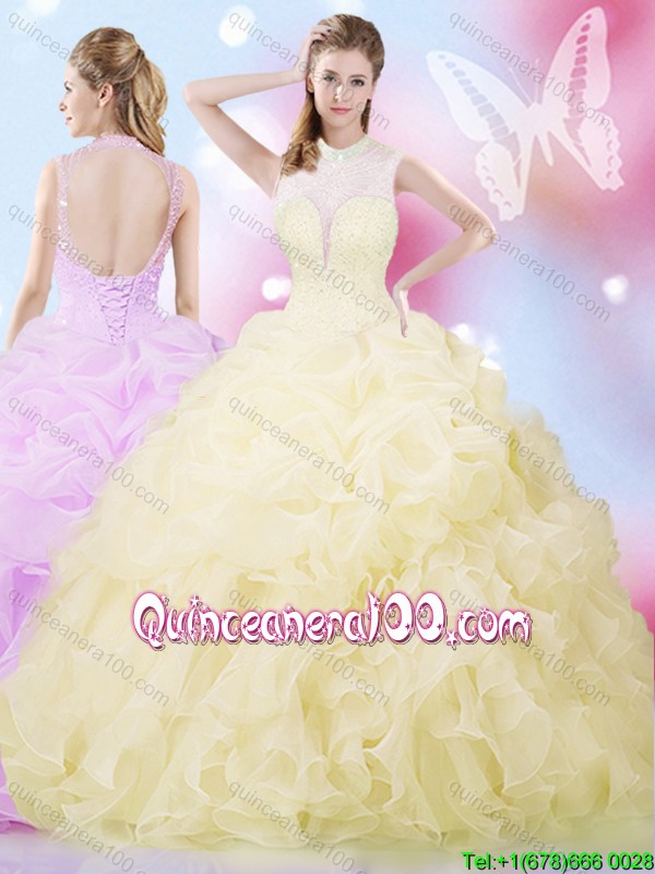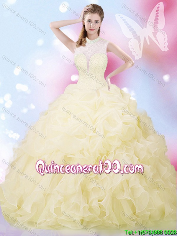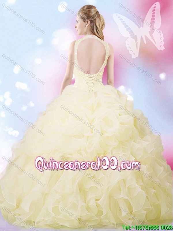 Neckline : High-neckShown Color : Light YellowSilhouette : Ball GownsSleeve Length : sleevelessHemline : floor lengthBack Detail : Lace upFabric : OrganzaEmbellishment : Beading,Ruffles,Pick UpsOccasion : Military Ball,Sweet 16,QuinceaneraSeason : Spring,Summer,Fall,Winter