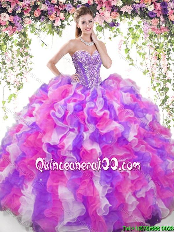 Neckline : SweetheartShown Color : Multi-colorSilhouette : Ball GownsSleeve Length : sleevelessHemline : floor lengthBack Detail : Lace upFabric : OrganzaEmbellishment : Beading,RufflesOccasion : Sweet 16,QuinceaneraSeason : Spring,Summer,Fall,Winter