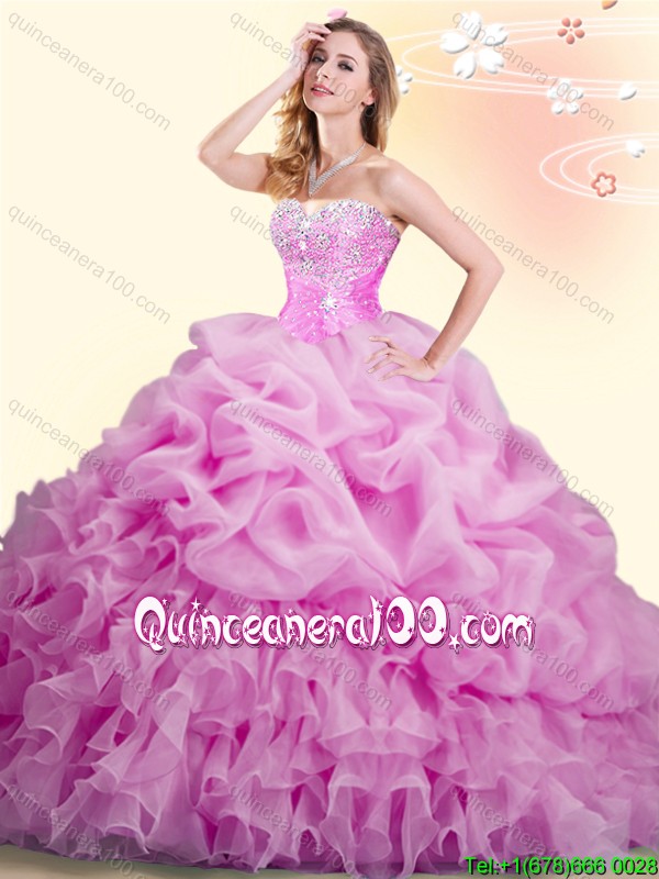Neckline : SweetheartShown Color : Rose PinkSilhouette : Ball GownsSleeve Length : sleevelessHemline : with trainBack Detail : Lace upFabric : OrganzaEmbellishment : Beading,Ruffles,Pick UpsOccasion : Military Ball,Sweet 16,QuinceaneraSeason : Spring,Summer,Fall,Winter