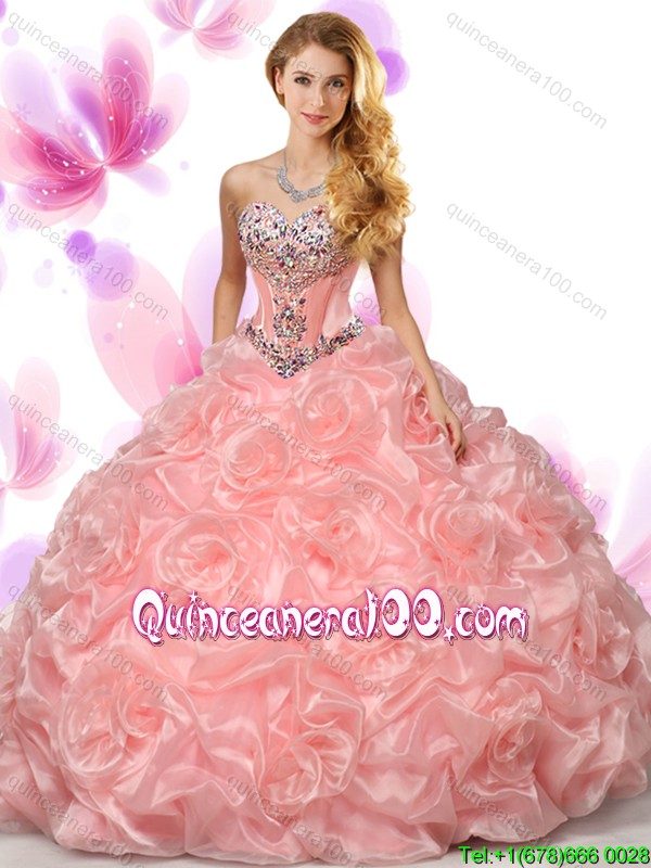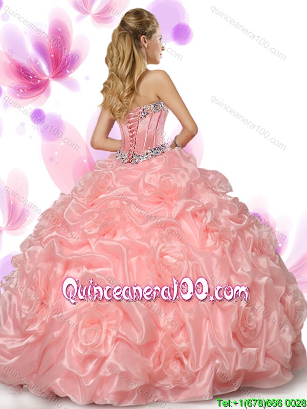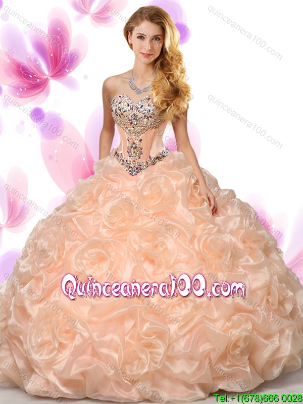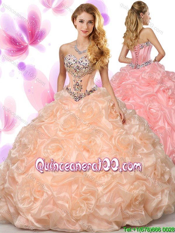 Neckline : SweetheartShown Color : OrangeSleeve Length : sleevelessHemline : floor lengthBack Detail : Lace upFabric : Organza,Fabric With Rolling FlowersEmbellishment : Beading,Pick UpsOccasion : Sweet 16,QuinceaneraSeason : Spring,Summer,Fall,Winter