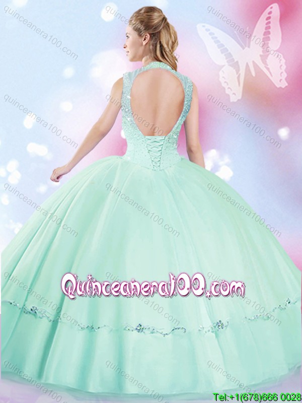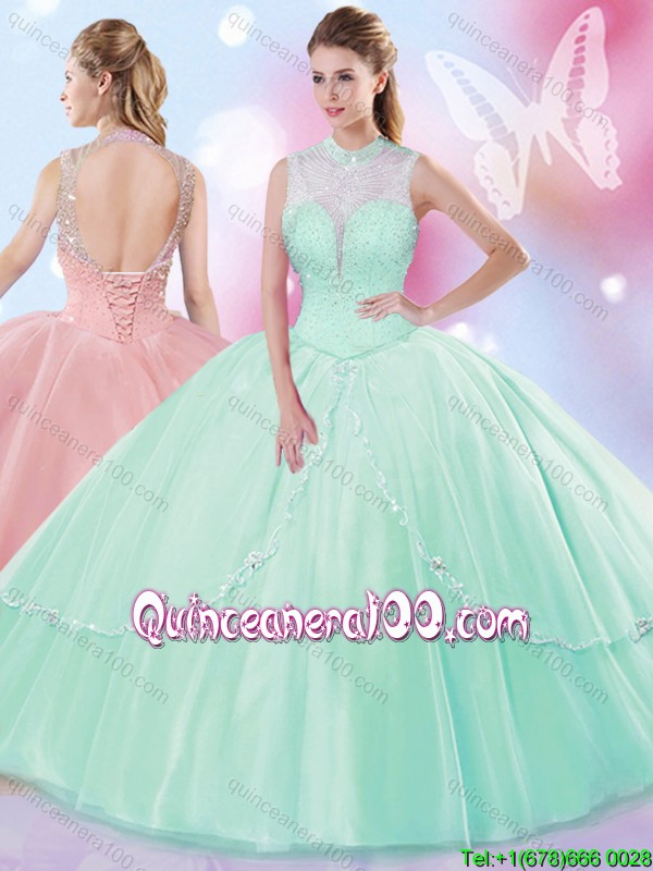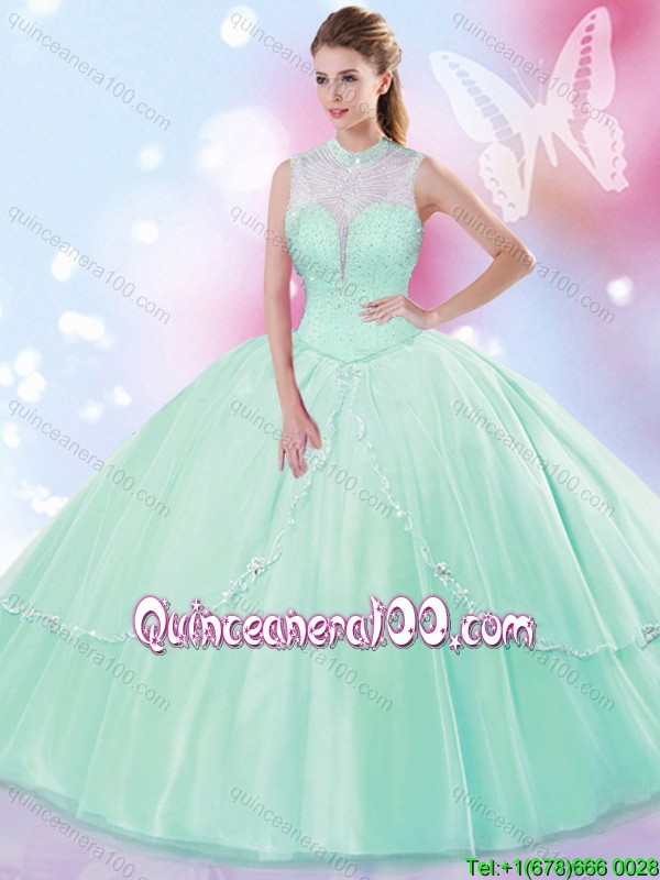 Neckline : High-neckShown Color : Apple GreenSilhouette : Ball GownsSleeve Length : sleevelessHemline : floor lengthBack Detail : Lace upFabric : TulleEmbellishment : BeadingOccasion : Sweet 16,QuinceaneraSeason : Spring,Summer,Fall,Winter