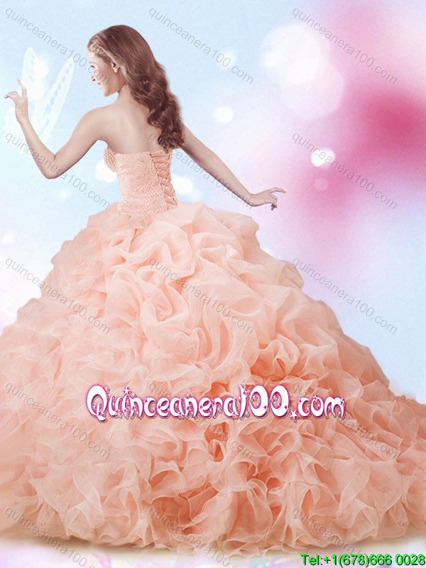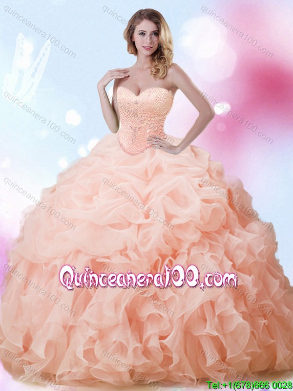 Neckline : SweetheartShown Color : OrangeSleeve Length : sleevelessHemline : with trainBack Detail : Lace upFabric : OrganzaEmbellishment : Beading,Ruffles,Pick UpsOccasion : Military Ball,Sweet 16,QuinceaneraSeason : Spring,Summer,Fall,Winter