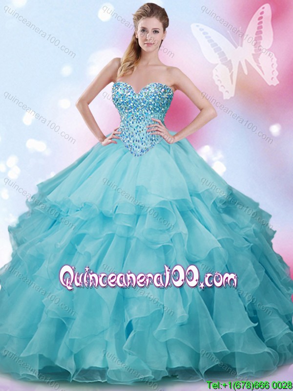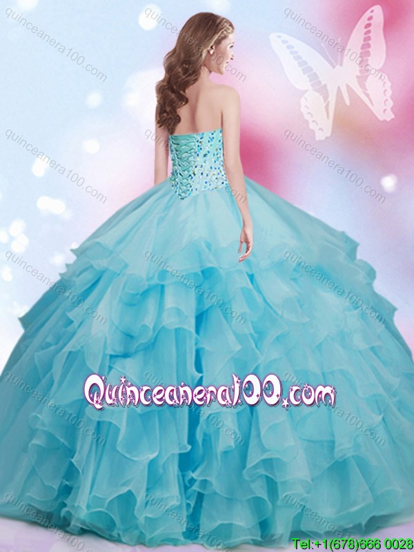 Neckline : SweetheartShown Color : Baby BlueSilhouette : Ball GownsSleeve Length : sleevelessHemline : floor lengthBack Detail : Lace upFabric : OrganzaEmbellishment : RufflesOccasion : Sweet 16,QuinceaneraSeason : Spring,Summer,Fall,Winter