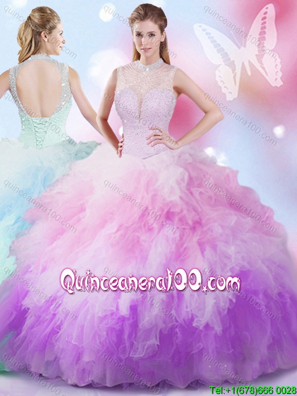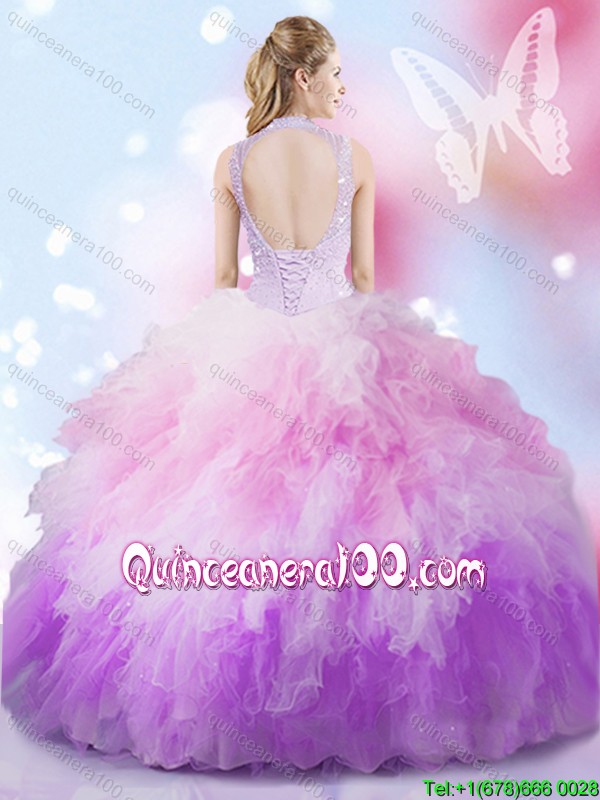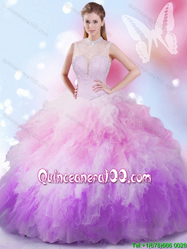 Neckline : High-neckShown Color : Multi-colorSleeve Length : sleevelessHemline : floor lengthBack Detail : Lace upFabric : TulleEmbellishment : Beading,RufflesOccasion : Sweet 16,QuinceaneraSeason : Spring,Summer,Fall,Winter