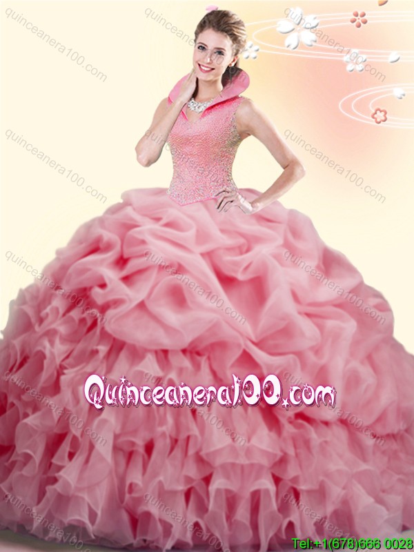 Neckline : High-neckShown Color : Watermelon RedSleeve Length : sleevelessHemline : with trainBack Detail : BacklessFabric : OrganzaEmbellishment : Beading,Ruffles,Pick UpsOccasion : Sweet 16,QuinceaneraSeason : Spring,Summer,Fall,Winter