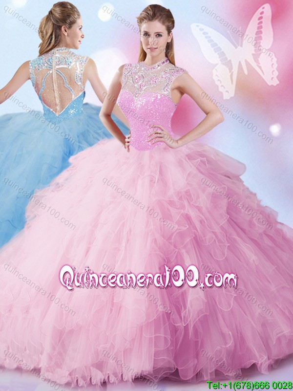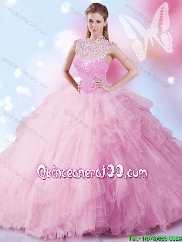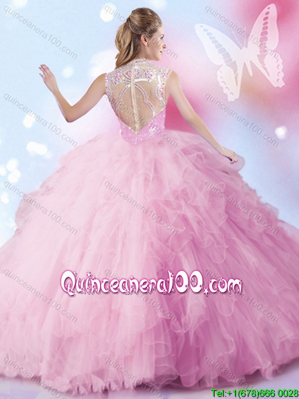 Neckline : SweetheartShown Color : PinkSleeve Length : sleevelessHemline : floor lengthBack Detail : Lace upFabric : TulleEmbellishment : Beading,RufflesOccasion : Sweet 16,QuinceaneraSeason : Spring,Summer,Fall,Winter