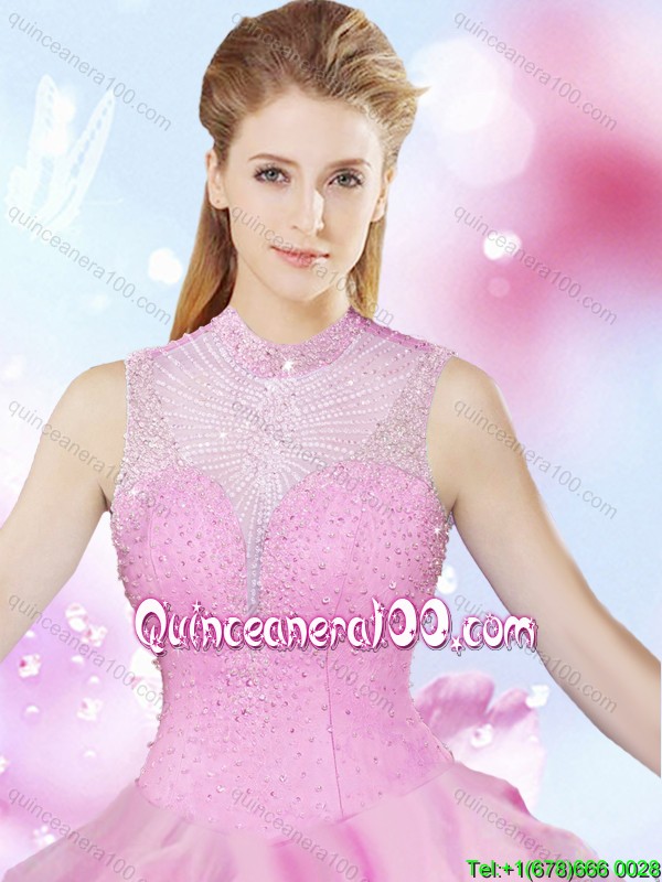 Neckline : High-neckShown Color : Rose PinkSilhouette : Ball GownsSleeve Length : sleevelessHemline : floor lengthBack Detail : Lace upFabric : TulleEmbellishment : Beading,RufflesOccasion : Military Ball,Sweet 16,QuinceaneraSeason : Spring,Summer,Fall,Winter