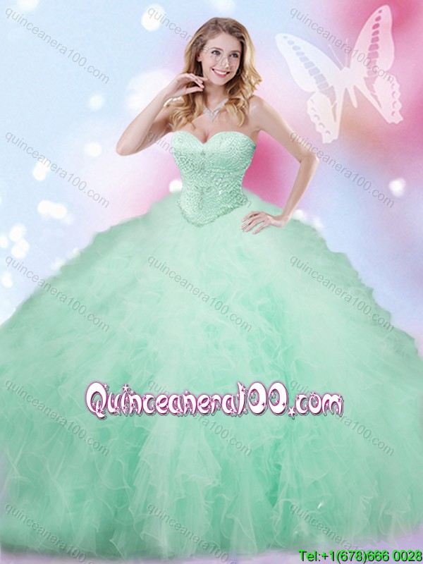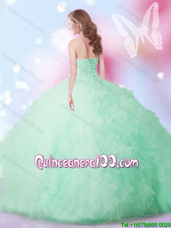 Neckline : SweetheartShown Color : Apple GreenSilhouette : Ball GownsSleeve Length : sleevelessHemline : floor lengthBack Detail : Lace upFabric : TulleEmbellishment : Beading,RufflesOccasion : Military Ball,Sweet 16,QuinceaneraSeason : Spring,Summer,Fall,Winter