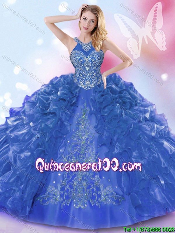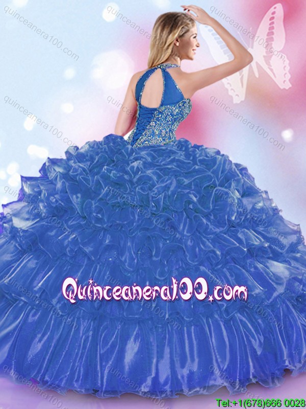 Neckline : Halter topShown Color : Royal BlueSilhouette : Ball GownsSleeve Length : sleevelessHemline : floor lengthBack Detail : Lace upFabric : OrganzaEmbellishment : Appliques,Ruffled LayersOccasion : Military Ball,Sweet 16,QuinceaneraSeason : Spring,Summer,Fall,Winter
