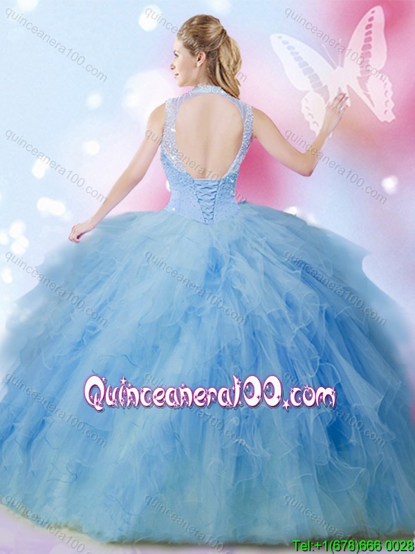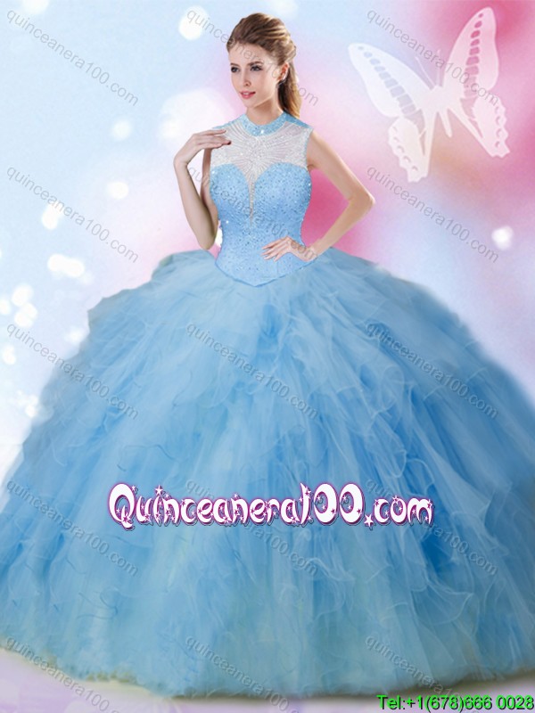 Neckline : High-neckShown Color : Baby BlueSilhouette : Ball GownsSleeve Length : sleevelessHemline : floor lengthBack Detail : Lace upFabric : TulleEmbellishment : Beading,RufflesOccasion : Military Ball,Sweet 16,QuinceaneraSeason : Spring,Summer,Fall,Winter