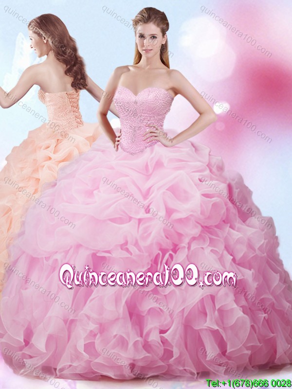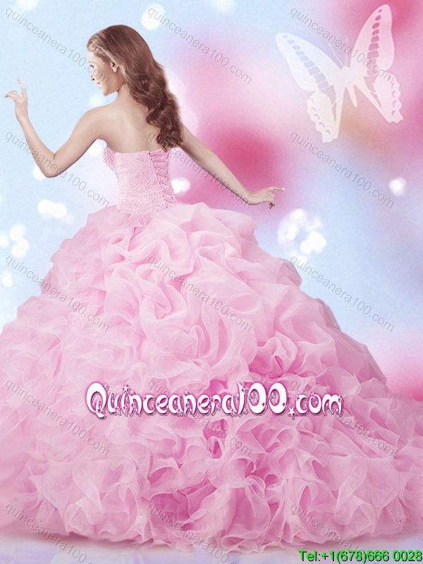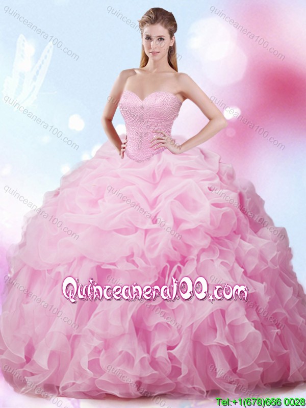 Neckline : SweetheartShown Color : Rose PinkSilhouette : Ball GownsSleeve Length : sleevelessHemline : with trainBack Detail : Lace upFabric : OrganzaEmbellishment : Beading,Ruffles,Pick UpsOccasion : Military Ball,Sweet 16,QuinceaneraSeason : Spring,Summer,Fall,Winter