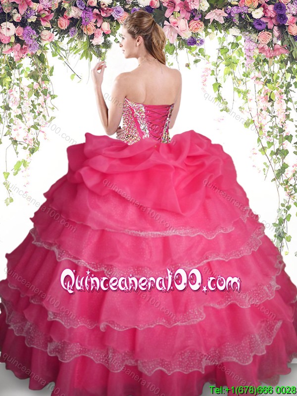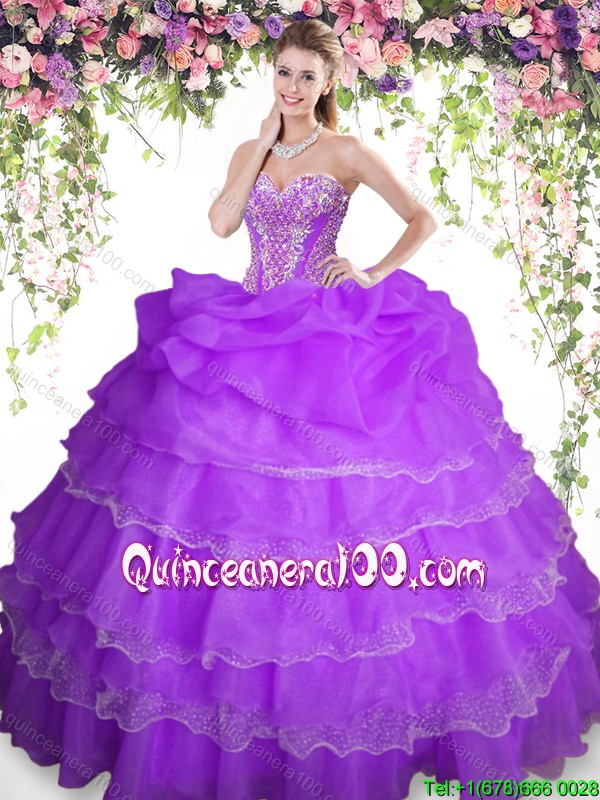 Neckline : SweetheartShown Color : PurpleSleeve Length : sleevelessHemline : floor lengthBack Detail : Lace upFabric : OrganzaEmbellishment : Beading,Ruffled Layers,Pick UpsOccasion : Military Ball,Sweet 16,QuinceaneraSeason : Spring,Summer,Fall,Winter