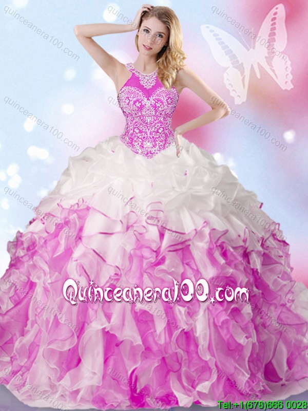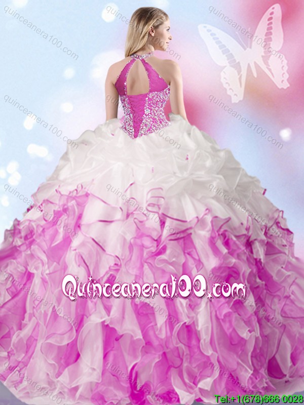 Neckline : Halter topShown Color : Multi-colorSleeve Length : sleevelessHemline : floor lengthBack Detail : Lace upFabric : OrganzaEmbellishment : Beading,Ruffles,Pick UpsOccasion : Military Ball,Sweet 16,QuinceaneraSeason : Spring,Summer,Fall,Winter