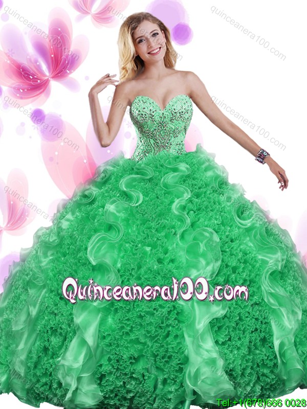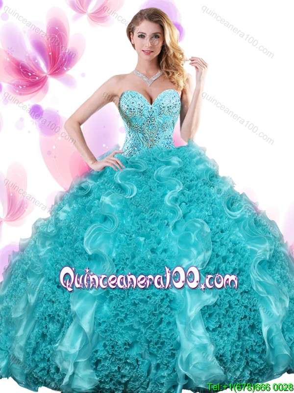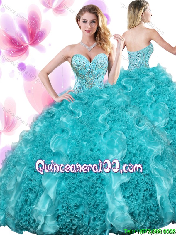 Neckline : SweetheartShown Color : TealSleeve Length : sleevelessHemline : floor lengthBack Detail : Lace upFabric : OrganzaEmbellishment : Beading,RufflesOccasion : Military Ball,Sweet 16,QuinceaneraSeason : Spring,Summer,Fall,Winter