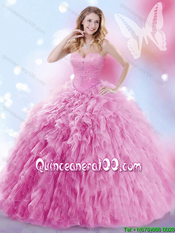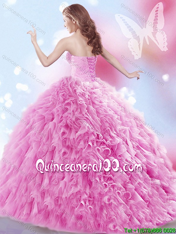 Cheap Beaded and Ruffled Rose Pink Quinceanera Dress with Brush Train