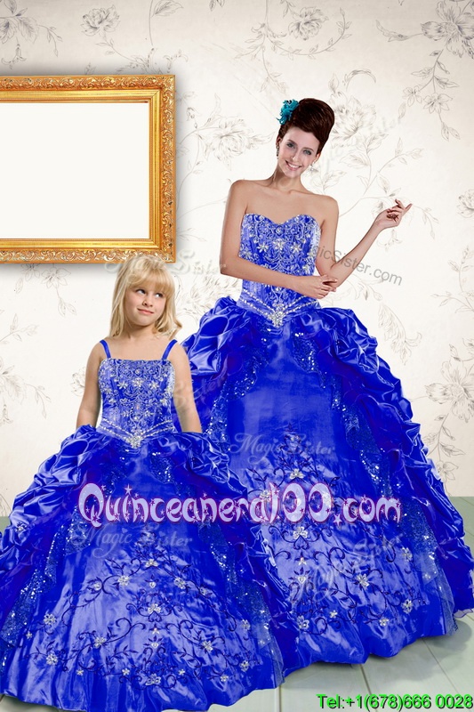 Neckline : StraplessShown Color : Royal BlueSilhouette : Ball GownsSleeve Length : sleevelessHemline : floor lengthBack Detail : Lace upFabric : TaffetaEmbellishment : Beading,Embroidery,Pick UpsOccasion : Military Ball,Sweet 16,QuinceaneraSeason : Spring,Summer,Fall,Winter