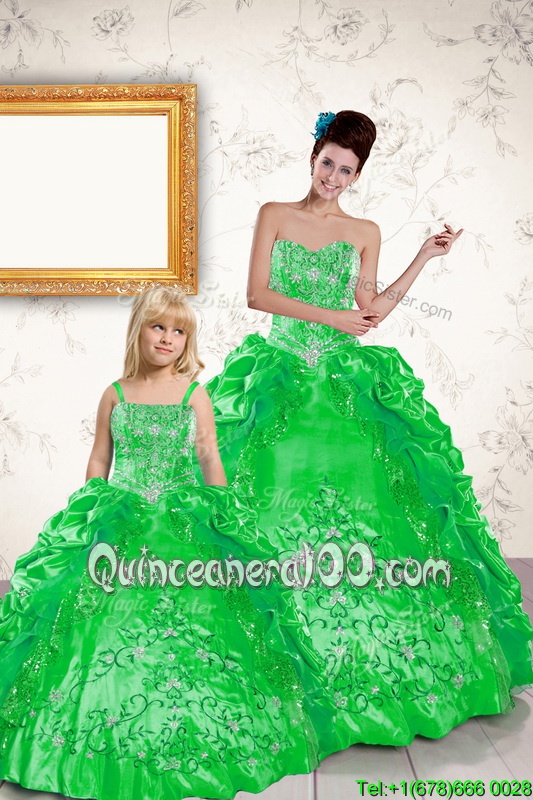 Neckline : SweetheartShown Color : GreenSilhouette : Ball GownsSleeve Length : sleevelessHemline : floor lengthBack Detail : Lace upFabric : TaffetaEmbellishment : Beading,Embroidery,Pick UpsOccasion : Military Ball,Sweet 16,QuinceaneraSeason : Spring,Summer,Fall,Winter