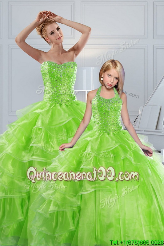 Excellent Spring Green Ball Gowns Organza Sweetheart Sleeveless Beading and Ruffled Layers Floor Length Lace Up Sweet 16 Dresses