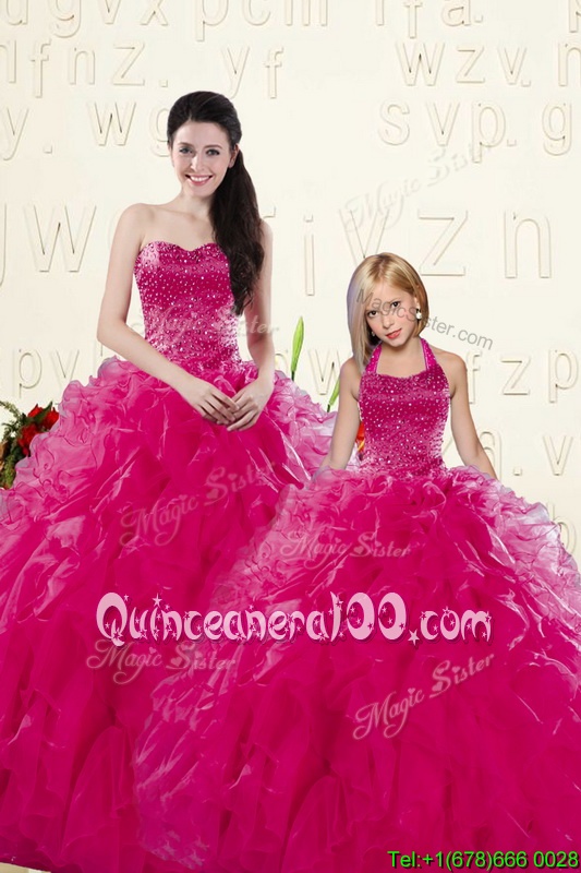Cute Fuchsia Lace Up Sweetheart Beading and Ruffles Sweet 16 Dresses Organza Sleeveless