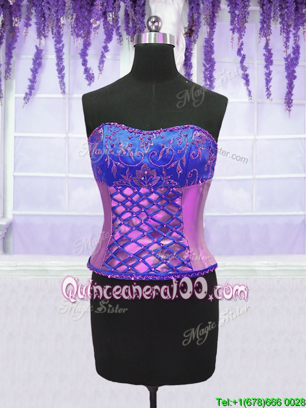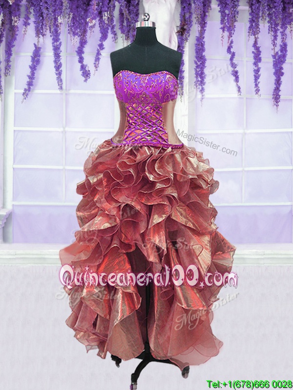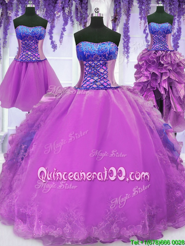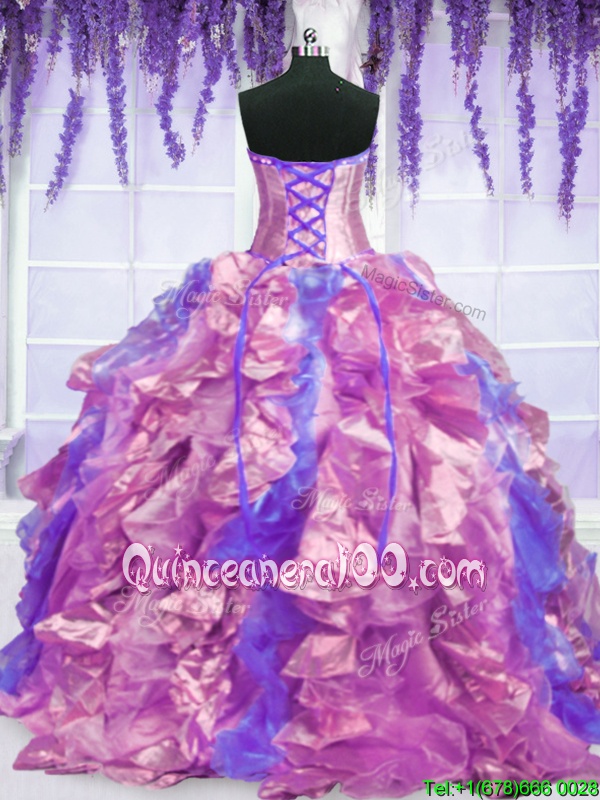 Neckline : StraplessShown Color : PurpleSilhouette : Ball GownsSleeve Length : sleevelessHemline : floor lengthBack Detail : Lace upFabric : OrganzaEmbellishment : Embroidery,RufflesOccasion : Military Ball,Sweet 16,QuinceaneraSeason : Spring,Summer,Fall,Winter