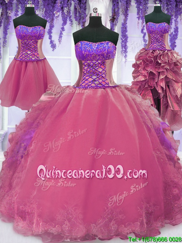 Neckline : StraplessShown Color : Pink Silhouette : Ball GownsSleeve Length : sleevelessHemline : floor lengthBack Detail : Lace upFabric : OrganzaEmbellishment : Embroidery,RufflesOccasion : Military Ball,Sweet 16,QuinceaneraSeason : Spring,Summer,Fall,Winter
